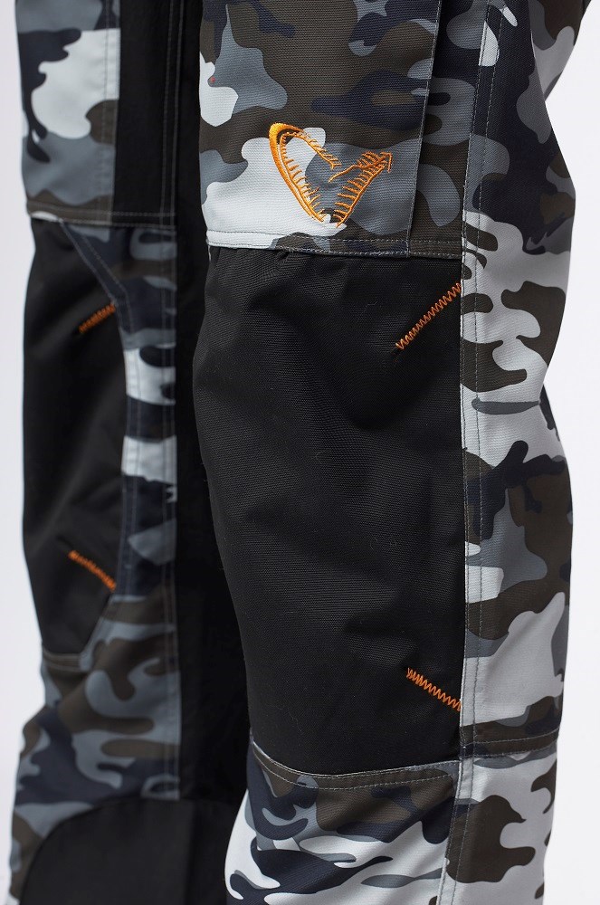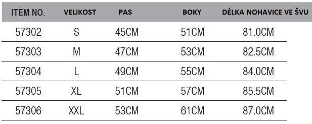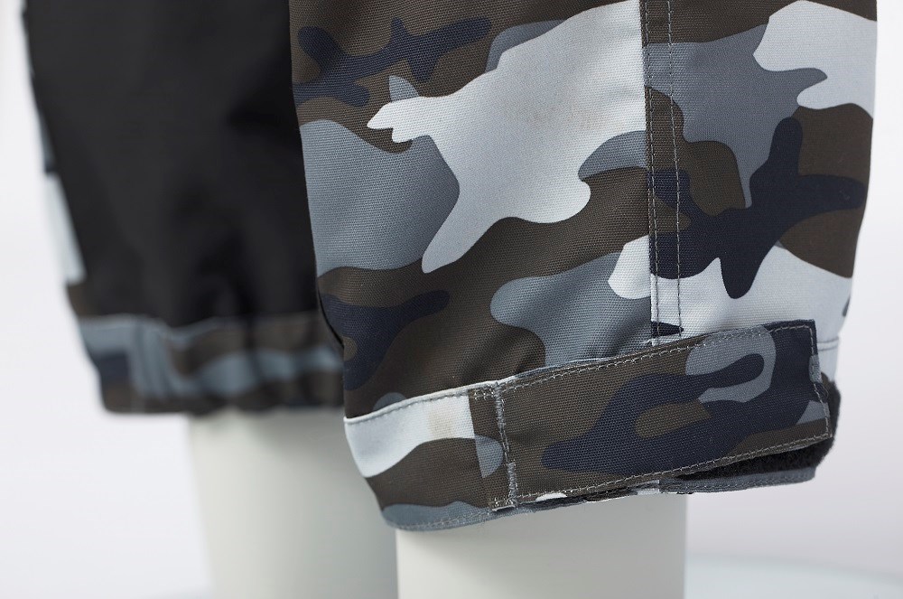 Shell tkanina ze silného 100% polyesteru taslon oxford smíšená s pružnou tkaninou z 95% nylonu / 5% spandexu. Voděodolná re-inforcement kolena, sedáku a vnitřní spodní části nohavic 100% nylonu taslon potaženého polyuretanem.