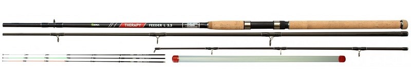 U prutu° Therapy feeder jsme prˇihle´dli k pozˇadavku°m neˇktery´ch feederarˇu° na prut s tvrdsˇi´ akci´ U prutu° Therapy feeder jsme prˇihle´dli k pozˇadavku°m neˇktery´ch feederarˇu° na prut s tvrdsˇi´ akci´ potrˇebnou prˇi pouzˇiti´ v proudny´ch voda´ch, prˇi lovu na delsˇi´ vzda´lenosti nebo tam, kde je nutne´ rybu rychle zaseknout a zdolat. Blank prutu je z uhli´kovy´ch vla´ken s vysoky´m modulem pruzˇnosti UHM (Ultra High Modulus). Trˇi´dimenziona´lni´ orientace vla´ken spolu s opletem da´va´ prutu vysokou pevnost a pruzˇnost prˇi zachova´ni´ jeho ni´zke´ hmotnosti. S pruty te´to konstrukce se velice dobrˇe a prˇesneˇ nahazuje, umozˇnˇuji´ potrˇebneˇ razantni´ za´sek, ale za´rovenˇ i sˇetrne´ a citlive´ zdola´va´ni´ ryby. Di´ky pomeˇru kvalita/cena se teˇsˇi´ tyto pruty velke´ oblibeˇ mezi ryba´rˇi, kterˇi´ si obli´bili feederovou techniku. Model Therapy feeder je vybaven osmi kvalitni´mi ocˇky, korkovou rukojeti´ a trnovy´mi spojkami. Soucˇa´sti´ prutu jsou trˇi vymeˇnitelne´ velmi jemne´ feederove´ sˇpicˇky z plne´ho a velmi odolne´ho kompozitni´ho materia´lu.