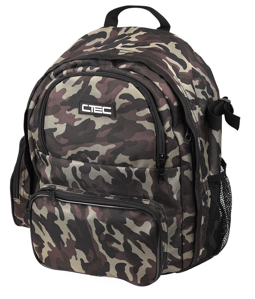 C-Tec Camou Backpack má hlavní komoru uzavíratelnou dvojitým zipem a 3 vnější kapsy na drobné příslušenství. Na boku se také nachází elastická síťová kapsa na skladování nápojů. Batoh je vybaven měkkými, "dýchajícími" zády, které umožňují lepší odvádění vlhkosti. Pohodlné, široké ramenní popruhy jsou vybaveny měkkými návleky. Batoh v kamuflážním provedení.