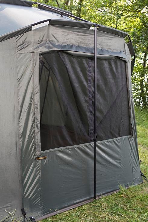Ideální i pro rybaření s rodinou. 4 velké hliníkové oblouky dělené na pět částí a garážová konstrukce umožňují snadné a rychlé postavení. Konstrukce z 19 mm tyčí zaručuje stabilitu i při nepříznivém počasí. Bivak je vyrobený z nepromokavé a vysoce odolné tkaniny 420D. Má 3 velké přední moskytiérové okna a jedno zadní, dokonalá ventilace během horkých letních dní. Silná kvalitní podlaha chrání proti hlodavcům, vodě a blátu. Plně odzipovatelné dveře umožní sledování dění kolem vody i v dešti a zároveň chrání proti vniknutí vody a bahna. Bivak poskytuje maximální komfort pro dva rybáře.