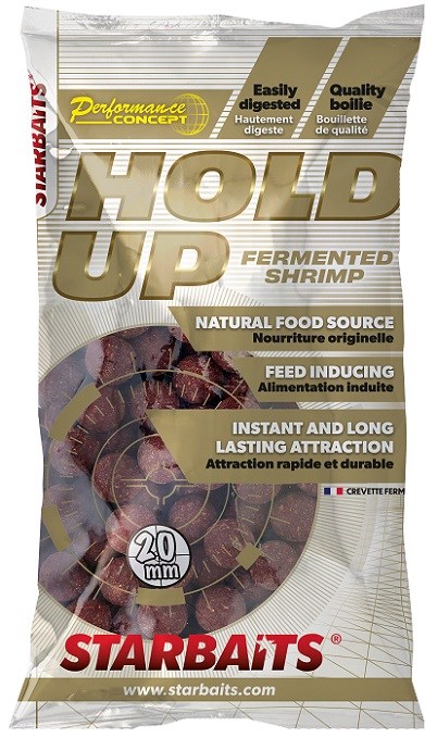 HOLD UP je směsí frementovaného (kvašeného) krevetového masa v kombinaci s živočišnými složkami s extrémně silnou pachovou stopou. Po dopadu do vody boilies okamžitě uvolňuje atraktační látky a rychle láká zejména velké kapry i z velké vzdálenosti. Fermentované ingredience navíc výrazně urychlují stravitelnost boilies (ryba se nepřesytí), a proto Hold Up doporučujeme také na masivní krmení.