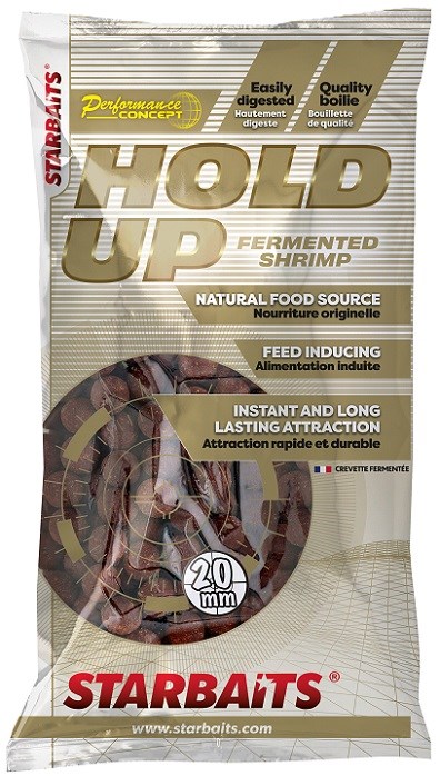 HOLD UP je směsí frementovaného (kvašeného) krevetového masa v kombinaci s živočišnými složkami s extrémně silnou pachovou stopou. Po dopadu do vody boilies okamžitě uvolňuje atraktační látky a rychle láká zejména velké kapry i z velké vzdálenosti. Fermentované ingredience navíc výrazně urychlují stravitelnost boilies (ryba se nepřesytí), a proto Hold Up doporučujeme také na masivní krmení.