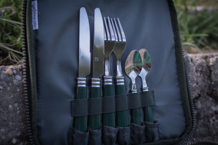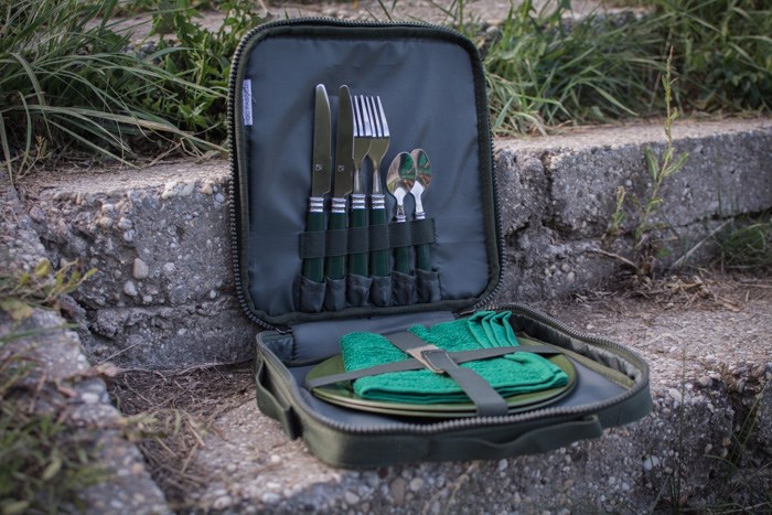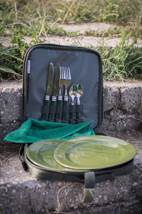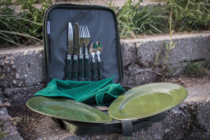 Kitchen Bag: Praktická jídelní sada. Obsahuje 2 talíře a dva kompletní příbory-nůž, vidlička, lžíce. Navíc obsahuje jednu vnější kapsu. Ucho na přenášení.