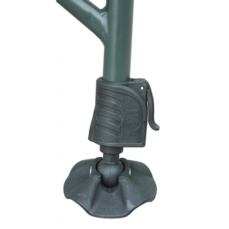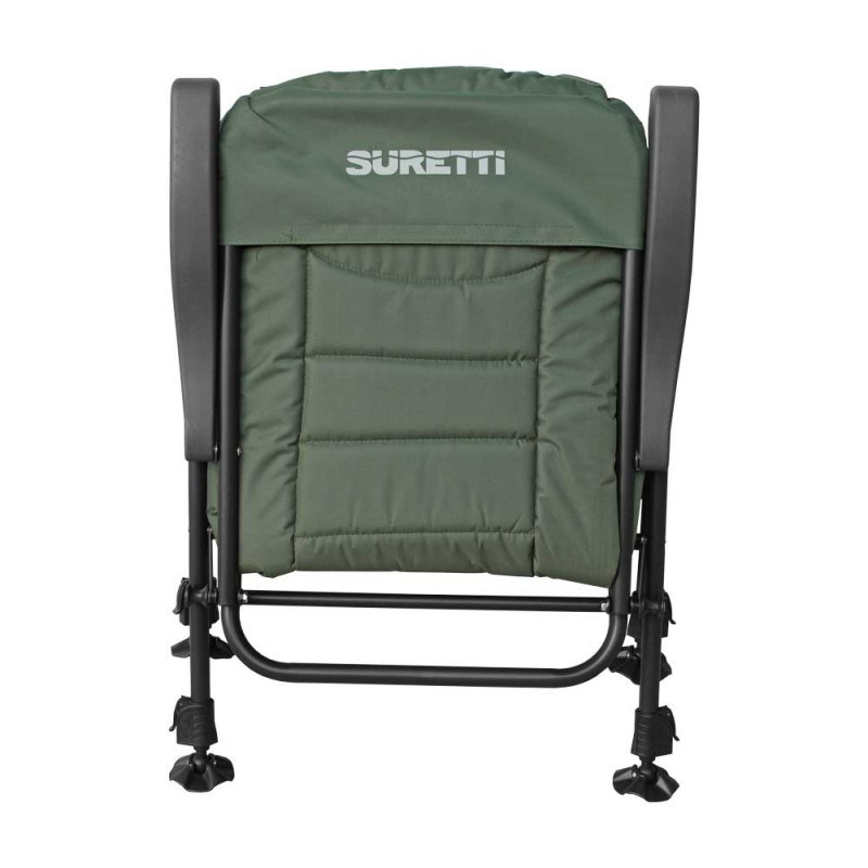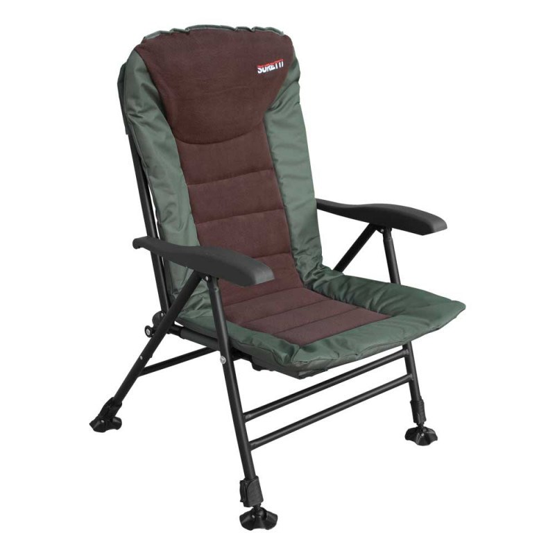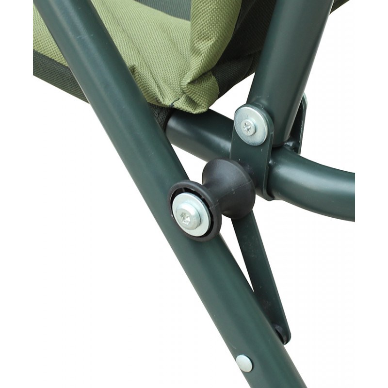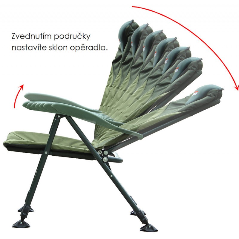 Konstrukce křesla je ocelová o tloušťce stěny 2mm a velmi jednoduchá, pevná s nosností až 160kg, jeho rozložení či složení je otázkou několika vteřin. Opěradlo má pohodlný polštář a na bocích matrace je lem, chránící před větrem a zimou. Pevné područky slouží k naklápění opěradla při jejich nadzdvižení (8 poloh). Teleskopické nohy jsou vybaveny spolehlivou aretací a protiskluzovými packami proti zaboření. Výška sedáku 37 - 56 cm bude pro mnohé velkou výhodou, při častém vstávání k prutům.