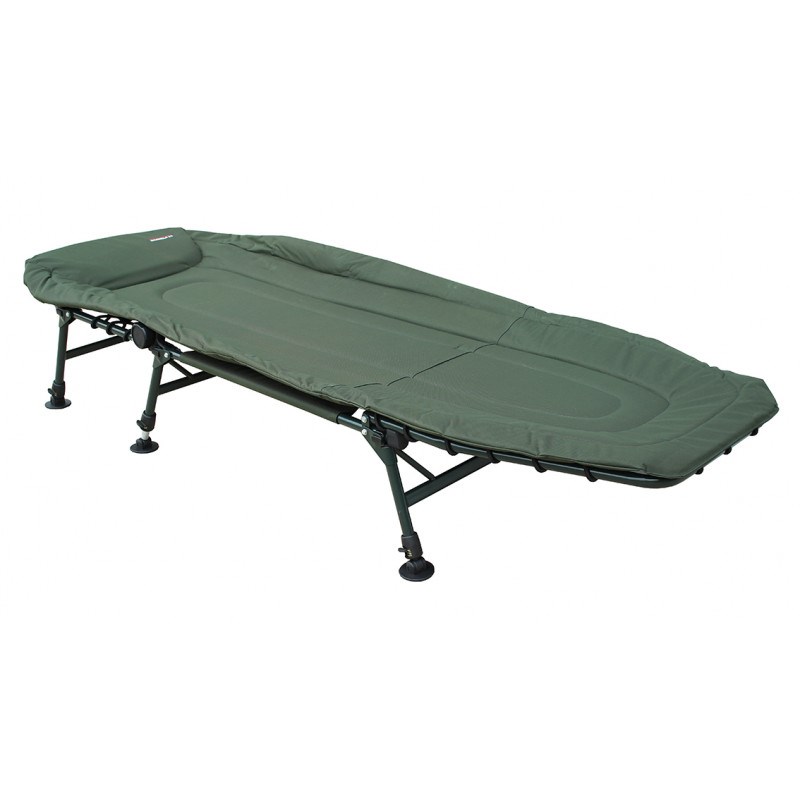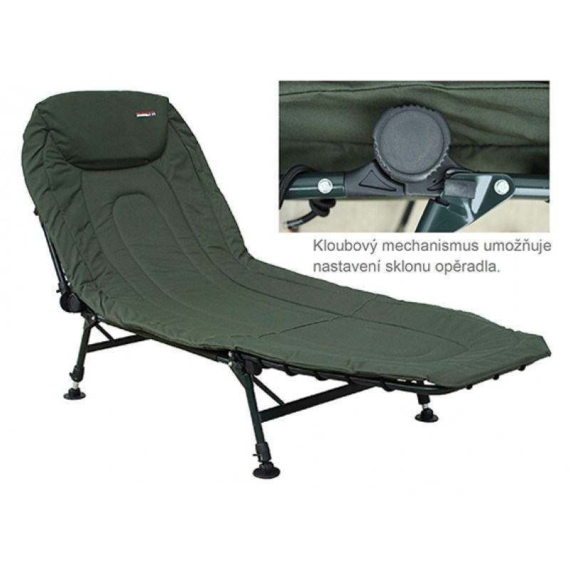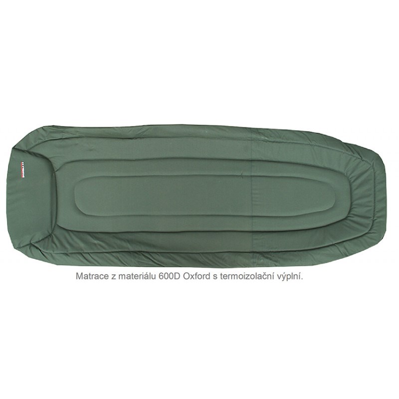 Lehátko Fishmaster s třemi páry nohou, ocelovou konstrukcí a matrací z 600D Oxford-Nylonu s termoizolační vrstvou.