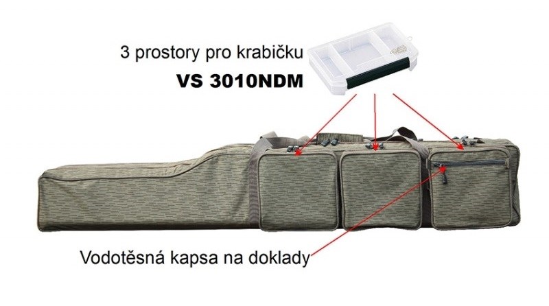 Tento obal vytváří dostatečný prostor na naviják nasazený na prutu. Na jedné straně je dlouhá kapsa po celé délce obalu 95x9x5cm na podběrák a nad ní jsou tři kapsy 20x10x5cm na drobnosti, nebo na krabičky Versus typu VS506, VS706 a VS806. Na druhé straně jsou tři kapsy o rozměru 20x20x5cm do kterých pasují krabičky typu VS3010NDM,VS3010ND a VS3010NS a jedna kapsa nepromokavá na doklady. Na popruhách jsou čtyři užitečná oka na zavěšení různých potřeb. Všude jsou použity velké pevné zipy s dvěma jezdci, které mají místo kovové rukojeti provázek s plastovým gripem. Obal je ušit z pevného 600D Oxford Nylon materiálu, který je velmi pevný a odolný.