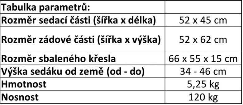 | Výbava | Opěradlo, Područky, Teleskopické nohy |