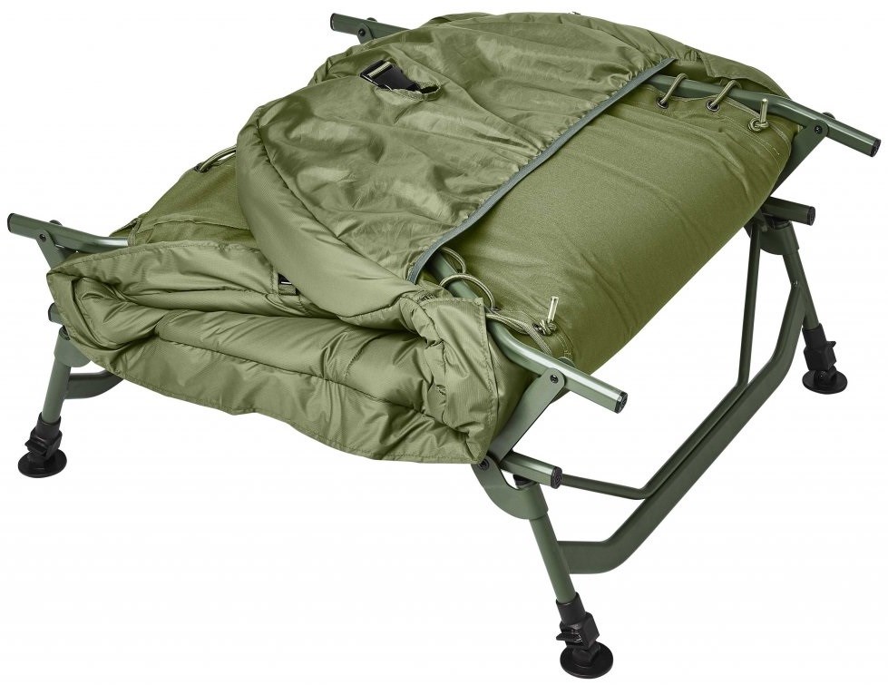 Celý systém zahrnuje spacák, díky tvaru lehátka se eliminují místa, která snadno prochladnou (nohy a hlava)
