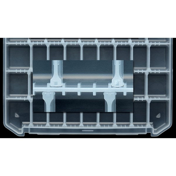 Krabička má 16 variabilních přepážek. Materiál: Polypropylen, zámek ABS. Worm Proof. Mikrožebrování dovoluje přenastavit přepážky tak, aby byl využit každý kousek prostoru. Rozměry 25,5 × 19 × 2,8 cm.