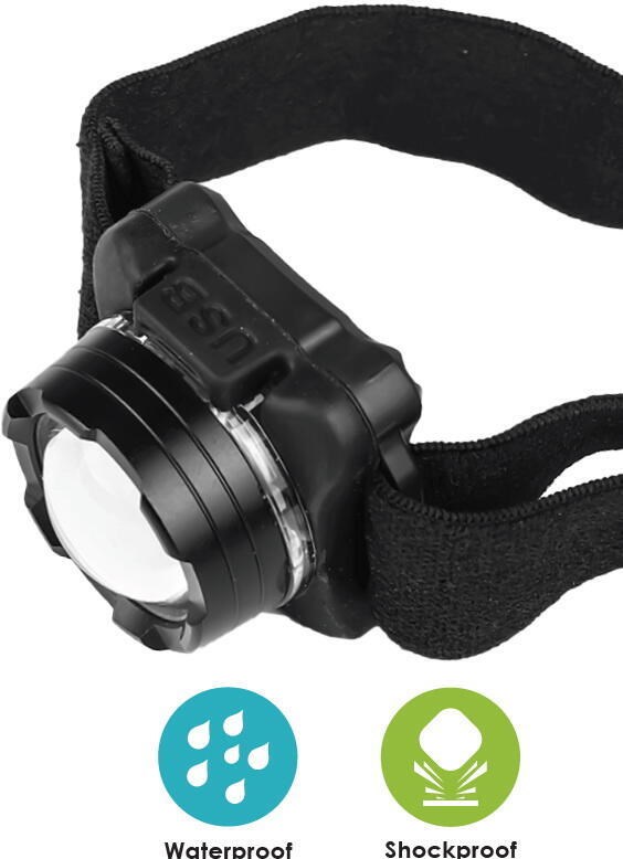 Voděodolná a prachuvzdorná výkonná čelovka s integrovanou baterií s nabíjením přes USB.