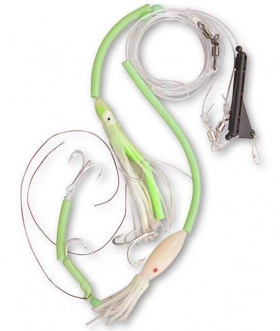 Dva systémy z jednoháčku velikosti 7/0 a trojháčku 2/0 pro rybí cáry nebo celou nástražní rybu, průměr kmenového vlasce 1,20 mm, průměr návazce 1,20 mm, nosnost 65 kg.